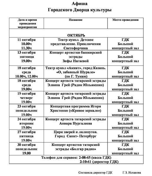 Афиша Городского Дворца культуры г. Нурлат на октябрь