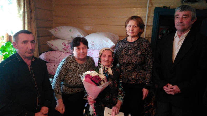 Надежда Константиновна до пенсии работала в колхозе. У юбиляршы 5 детей, 8 внуков и 4 правнука.