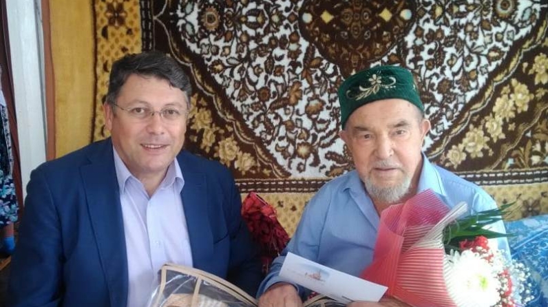 От имени Президента РФ Владимира Путина, главы района Алмаза Ахметшина юбиляра поздравил заместитель главы района Ильяс Ахметзянов.