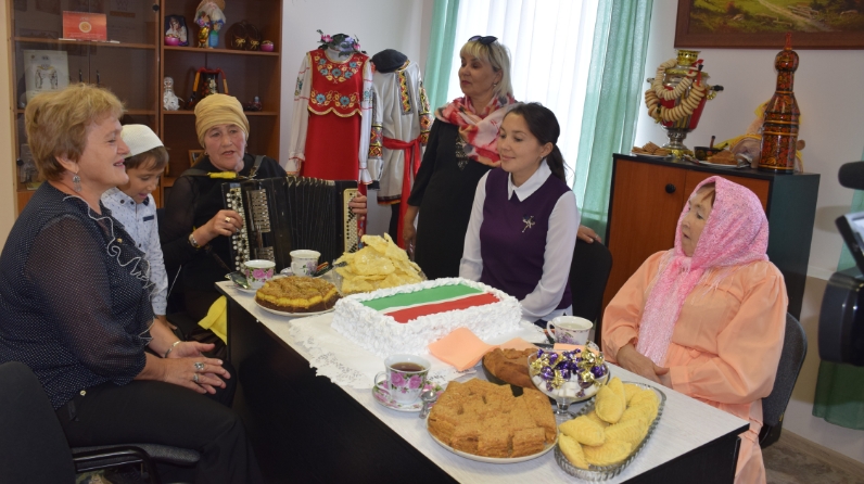 В качестве подарка к столу он принес одно из самых популярных блюд своего народа – шекербуру. Представительница чувашского объединения Валентина Матросова угостила курником, а Суфия Махмутова – популярным татарским национальным блюдом – кош теле (хворост). Всем понравился и торт, на котором изображен флаг Республики Татарстан от представителя армянского народа в районе Сати Шахназарян. Жители дружного дома все вместе попили чай, а потом под гармонь Суфии Махмутовой спели популярную песню «Мин яратам сине, Татарстан!»