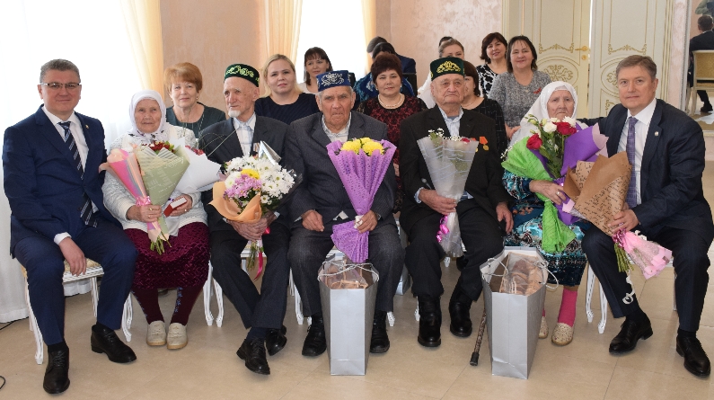 Сегодня в здании отдела ЗАГС исполнительного комитета Нурлатского муниципального района было по-особенному торжественно. Глава Нурлатского муниципального района Алмаз Ахметшин и первый заместитель Премьер-министра РТ Рустам Нигматуллин поздравили и вручили юбилейную медаль «75 лет Победы в Великой Отечественной войне 1941-1945 гг.» и памятный знак к 100-летию образования ТАССР труженикам тыла Хасибулле Матыгуловичу и Гаян Ибрагимовне Валиуллиным, Габбасу Ахметкаримовичу и Магруй Бикмухаметовне Нуртдиновым, Тагиру Гильмутдиновичу и Минслу Сафиулловне Сатдаровым. Они гордость района, семейный стаж каждой семейной пары исчисляется десятилетиями. Например, Валиуллины вместе прожили 72-летнюю жизнь, Сатдаровы – 64, Нуртдиновы – 63 года вместе. Все они воспитали достойных детей, помогли поставить на ноги внуков, радуются правнукам. Здесь же тружеников тыла поздравили многочисленные родные и близкие.
