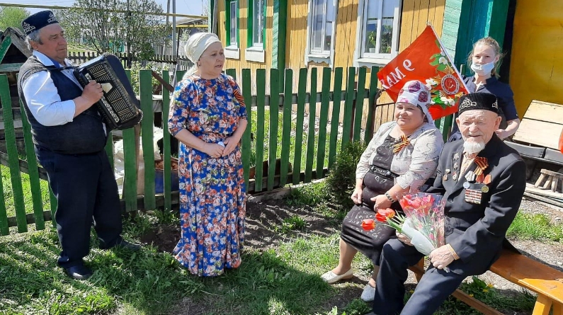 Артисты художественной самодеятельности Чулпанова в рамках районной акции «Фронтовая агитбригада» поздравили единственного ветерана своего села Каима Самигулловича Самигуллина с 75-летием Великой Победы у его дома и подарили праздничный концерт.