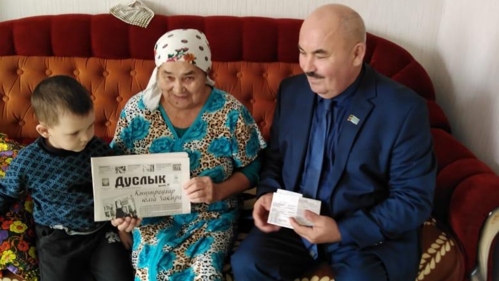 В рамках декады пожилого человека он подарил трем жительницам сельского поселения подписку на районную газету на трех языках. Таким образом, с нового года уважаемая учительница Людмила Ярмушкина из Якушкина будет читать газету на русском языке, одиноко проживающий ветеран труда Мария Матвеева из Абрыскина – на чувашском, продолжательница традиций ислама в деревне Салдакаево Саимя Мифтахова – на татарском.