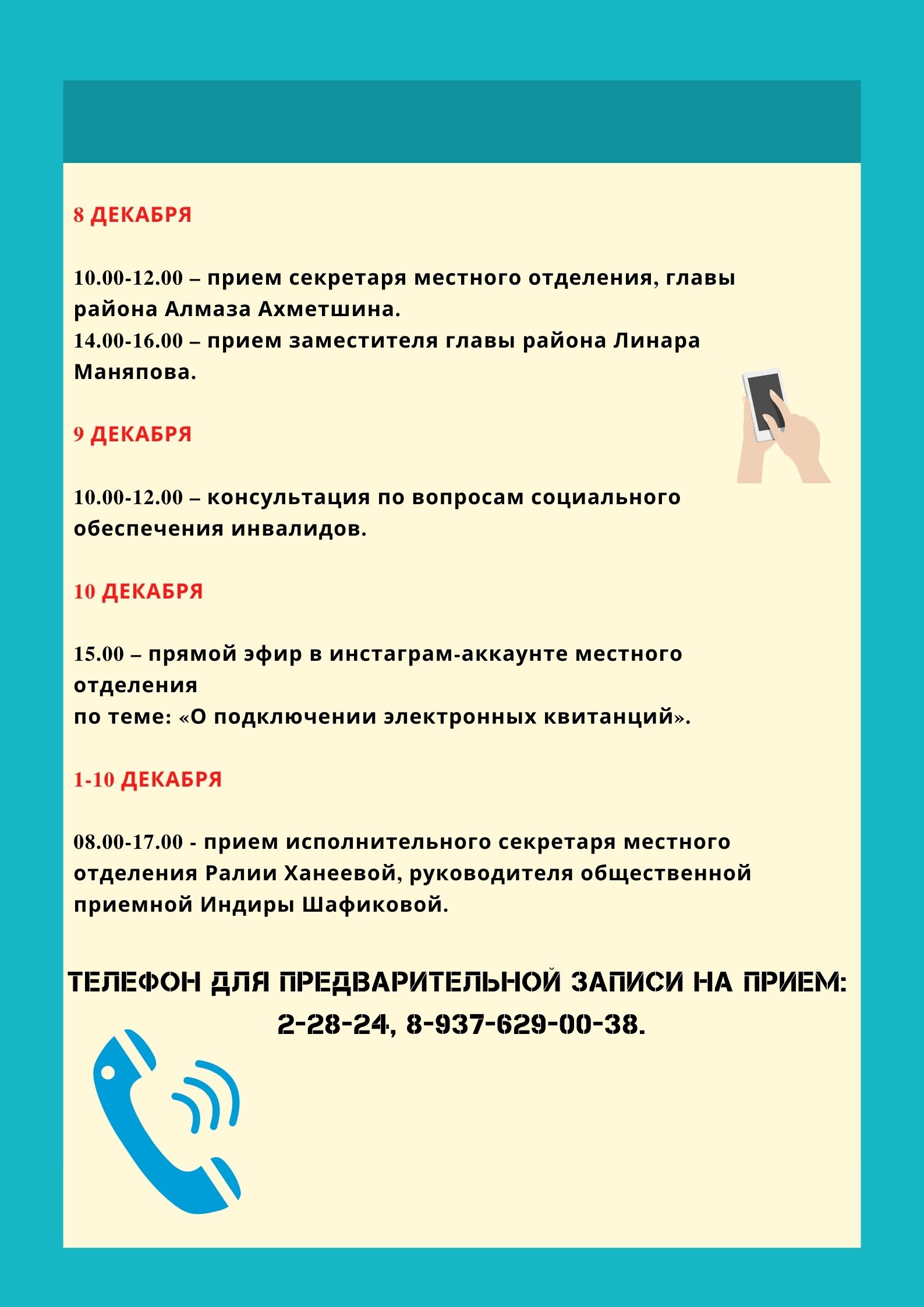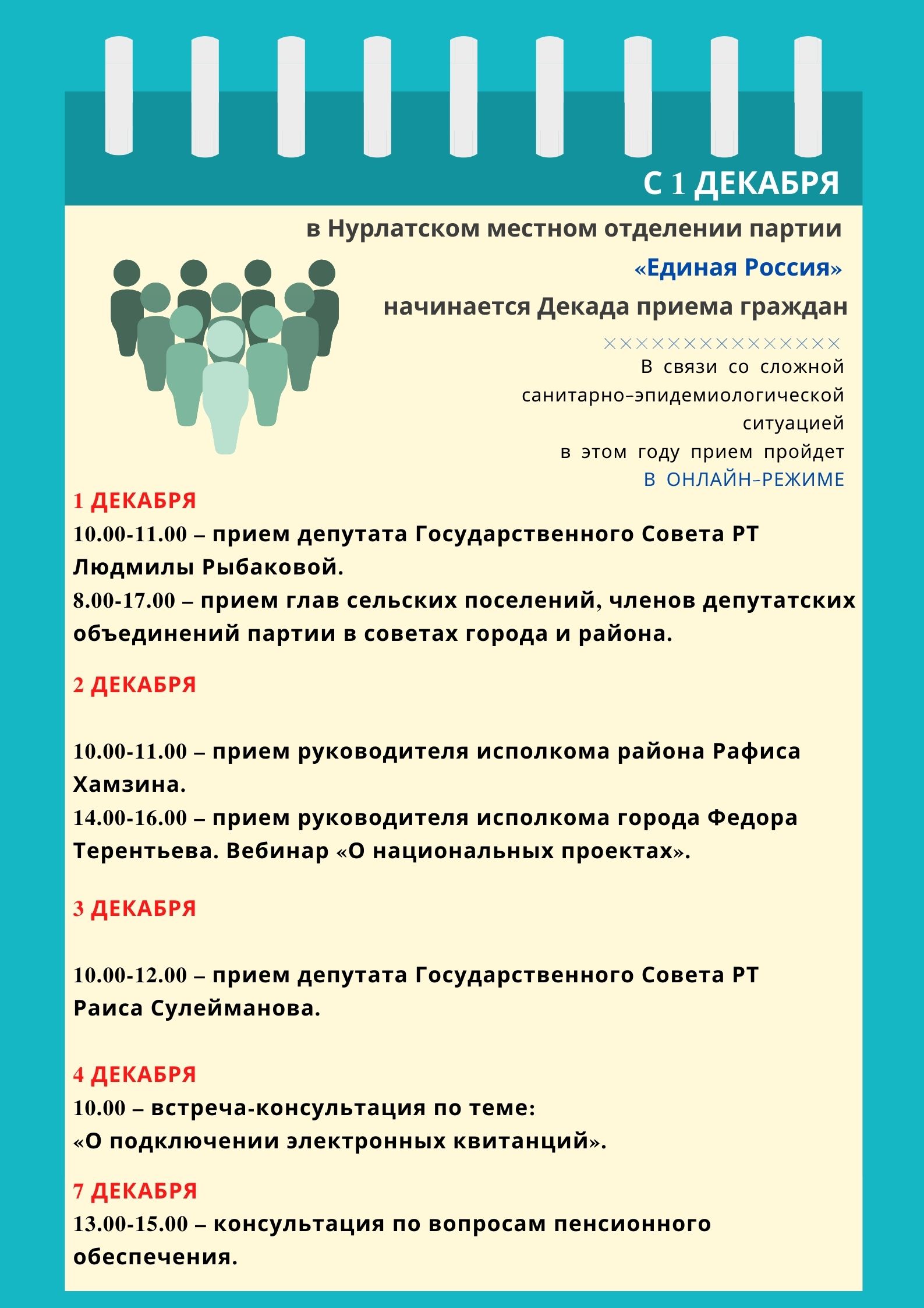 С 1 декабря в Нурлатском местном отделении партии «Единая Россия» начинается Декада приема граждан. Она стала традиционной, проводится ежегодно и посвящается дню рождения «Единой России».