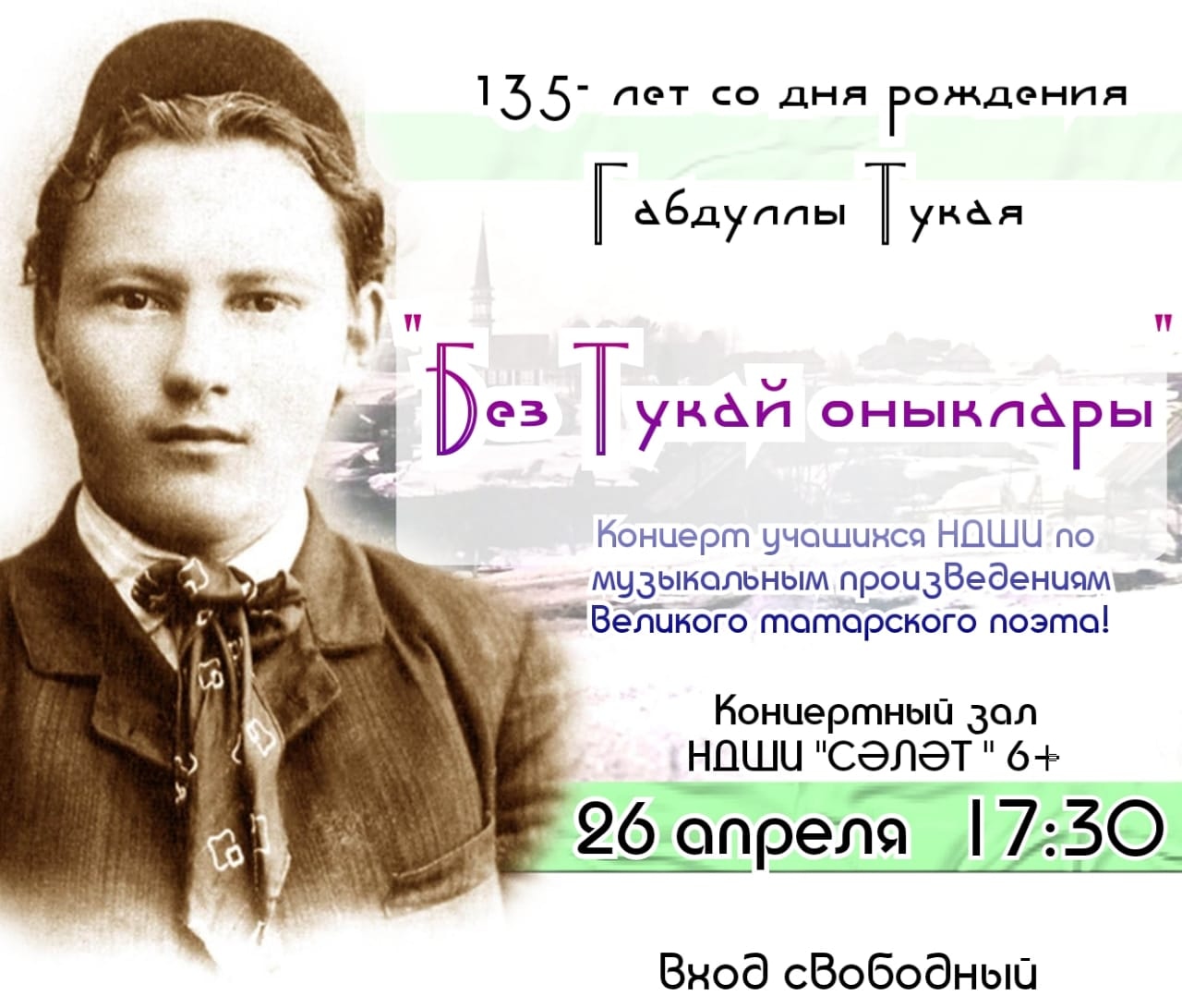 Завтра, 26 апреля, в Нурлатской детской школе искусств "Сэлэт" состоится концерт по музыкальным произведениям великого татарского поэта Габдуллы Тукая.