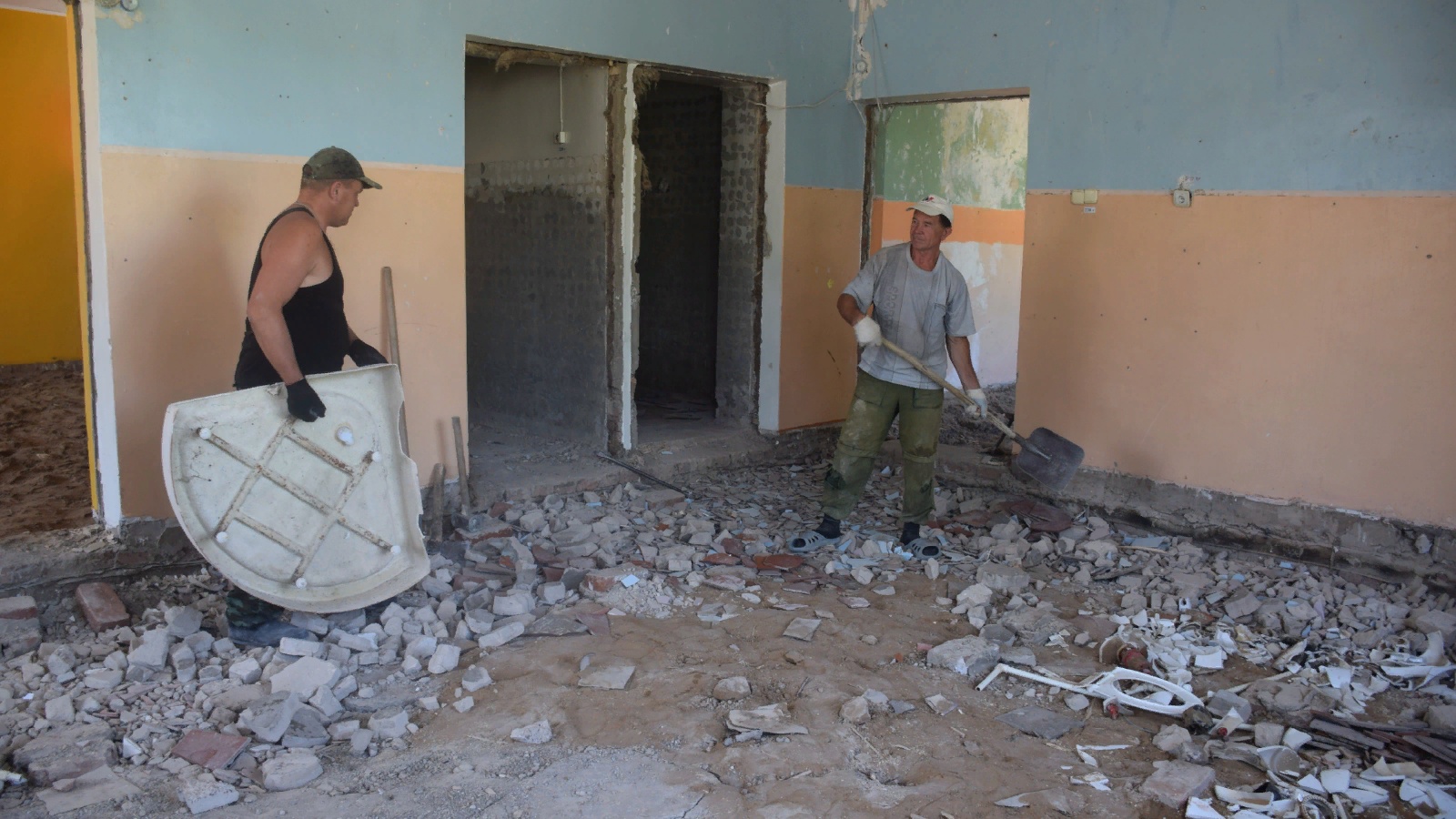 Двухэтажное строение детсада погрузилось в особый шум – здесь идут демонтажные работы. Сейчас, например, завершается демонтаж пола на первом этаже, на втором уже выполнили.