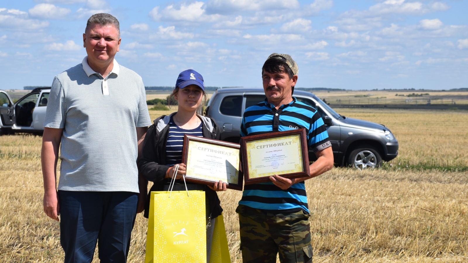 Сегодня глава Нурлатского района Алмаз Ахметшин вручил комбайнерам хозяйства и их помощникам, которые первыми перешагнули рубеж в 1 тысячу тонн, денежные сертификаты, а также футболки и бейсболки с символикой Нурлатского района.