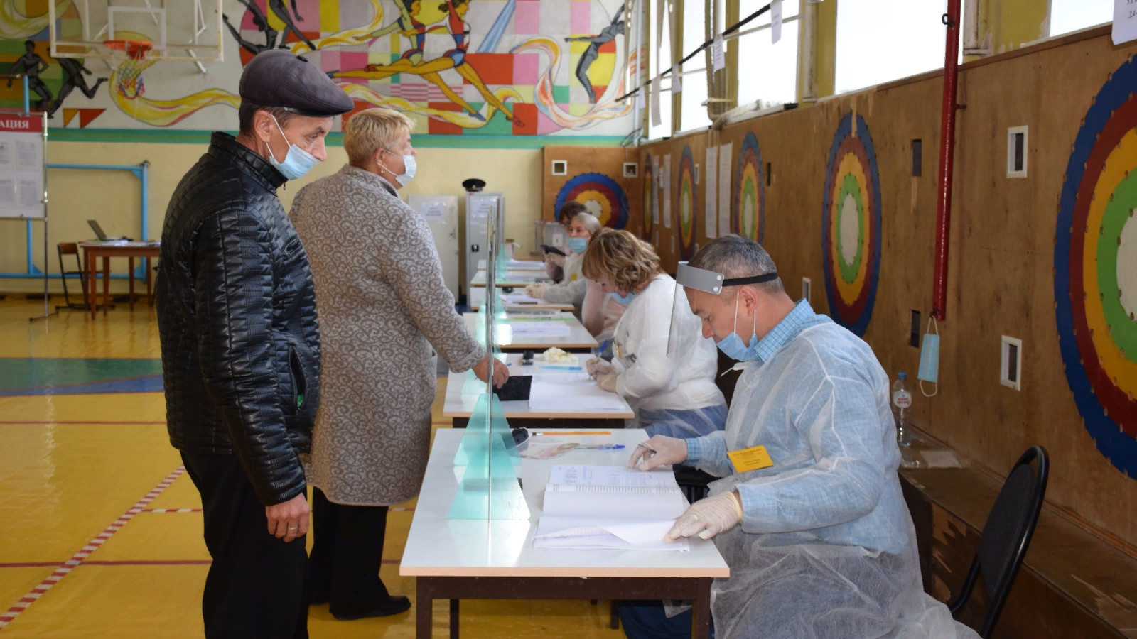 Большого скопления избирателей на участке не наблюдается, соблюдаются все антиковидные требования, члены избирательной комиссии, их здесь 12, в защитных костюмах, от избирателей их разделяет защитный экран.