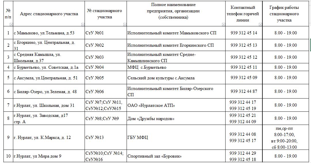 Адреса, телефоны, график работы стационарных участков в Нурлатском районе.