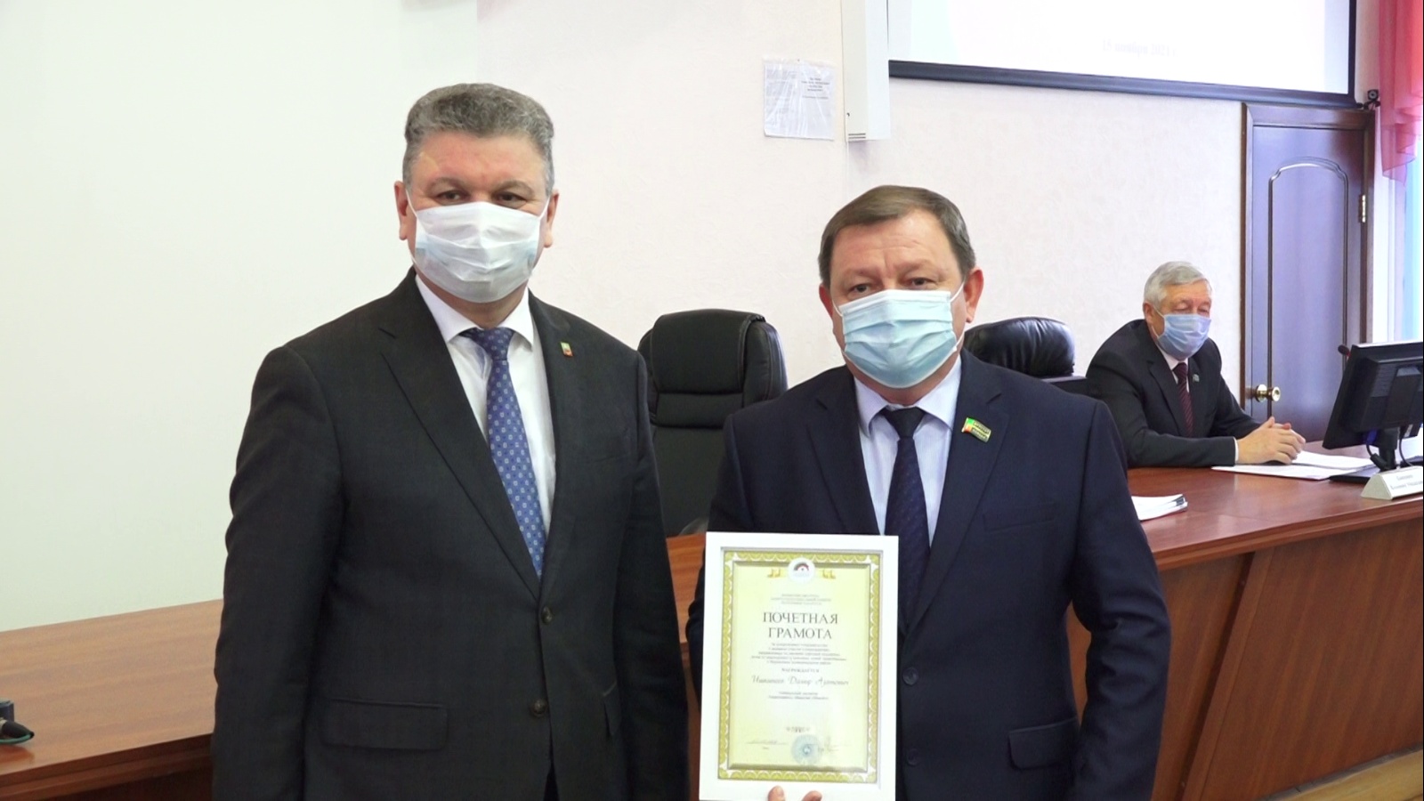 На сессии Советов Нурлатского муниципального района и города Нурлат глава района Алмаз Ахметшин вручил депутату Совета района, генеральному директору АО «Макойл» Дамиру Ишкинееву Почетную грамоту Министерства труда, занятости и социальной защиты РТ.
