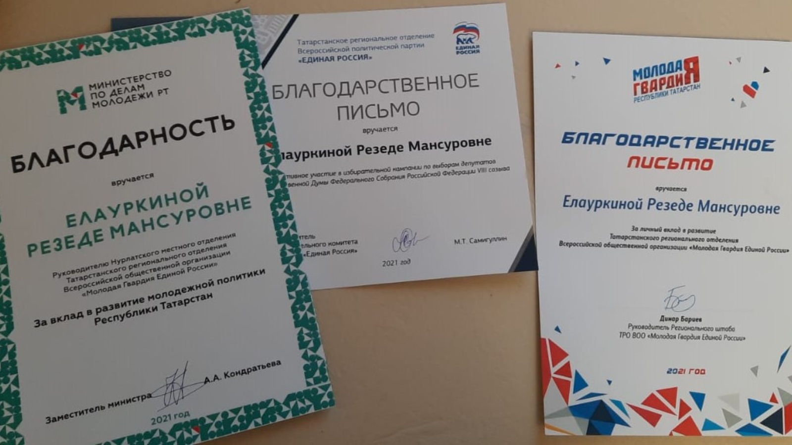 За вклад в развитие молодежной политики, активное участие в избирательной компании и успешную работу в «Молодой гвардии» Резеда Елауркина удостоилась Благодарственных писем.