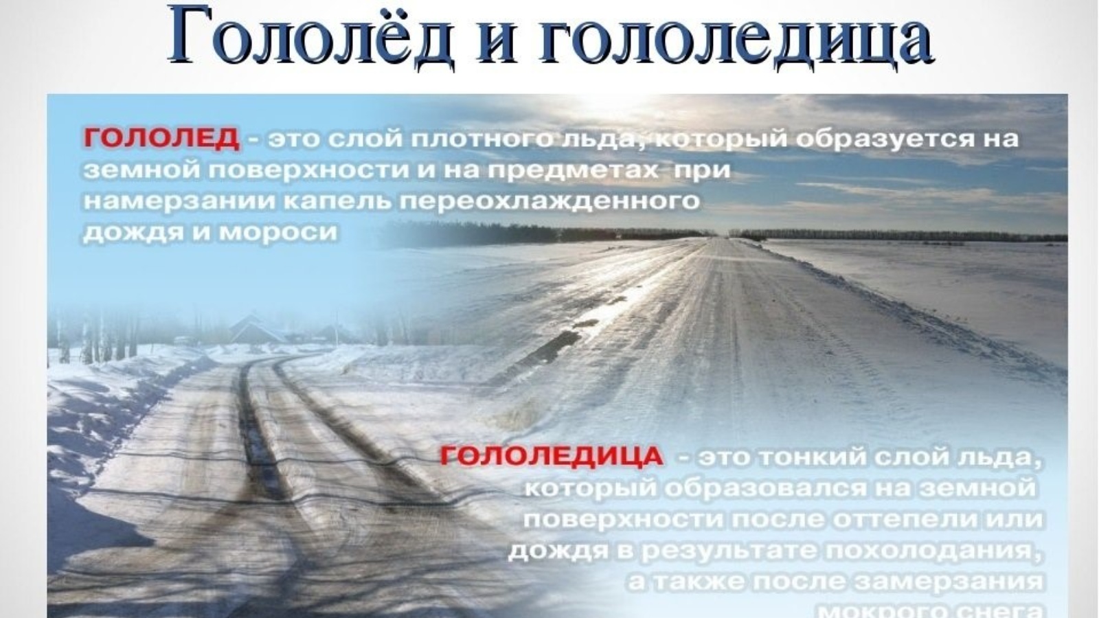Гололёд - следствие выпадения переохлажденных и/или замерзающих осадков (дождя, мороси), когда ледяная корка образуется и на горизонтальных, и на вертикальных поверхностях!!! При гололёде тоже отмечается гололедица, и в этом случае она значительно более «скользкая».