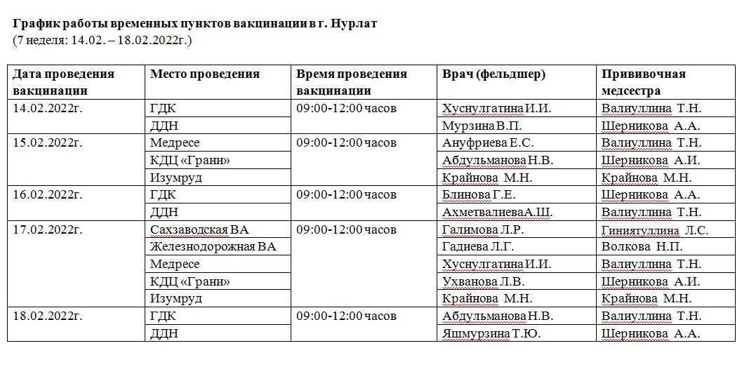 График работы пунктов вакцинации в Нурлате с 14 по 18 февраля