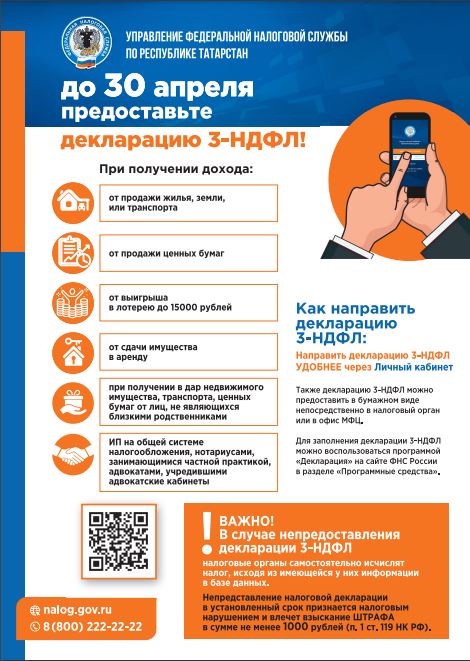 Управление Федеральной налоговой службы Республики Татарстан напоминает о необходимости предоставления налоговой декларации до 30 апреля.