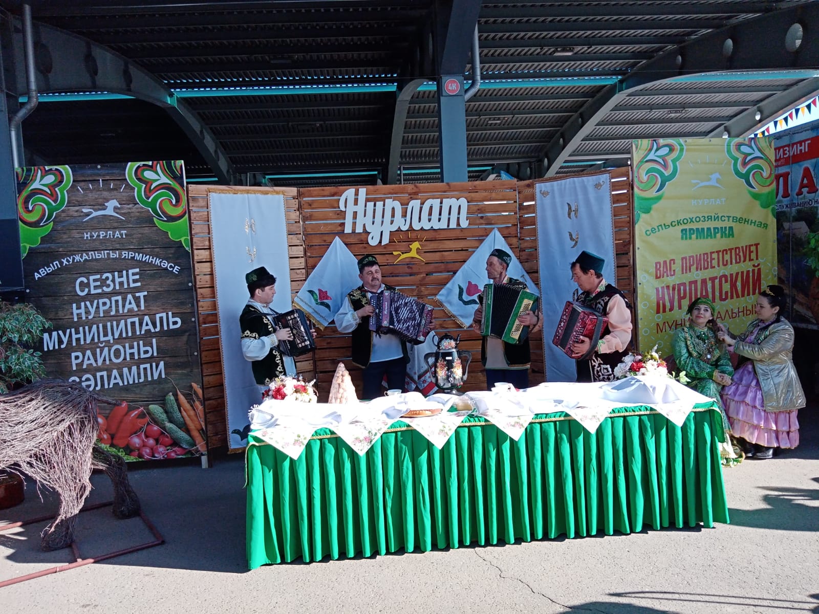 Свежие огурцы из тепличного хозяйства Файзуллиных, разливное молоко – кооператива «Восток», молочная продукция – «Нурлат сэте», мясная продукция – кооператива «Заготпром», хлеб и кулинарные изделия – ООО «Мякиш» и «Здоровье», свежее мясо из личных подсобных хозяйств… У торговых рядов с утра стояло оживление. Жителей столицы нурлатцы встретили праздничным столом к Пасхе – куличами, горячим чаем. В исполнении работников культуры звучали песни.