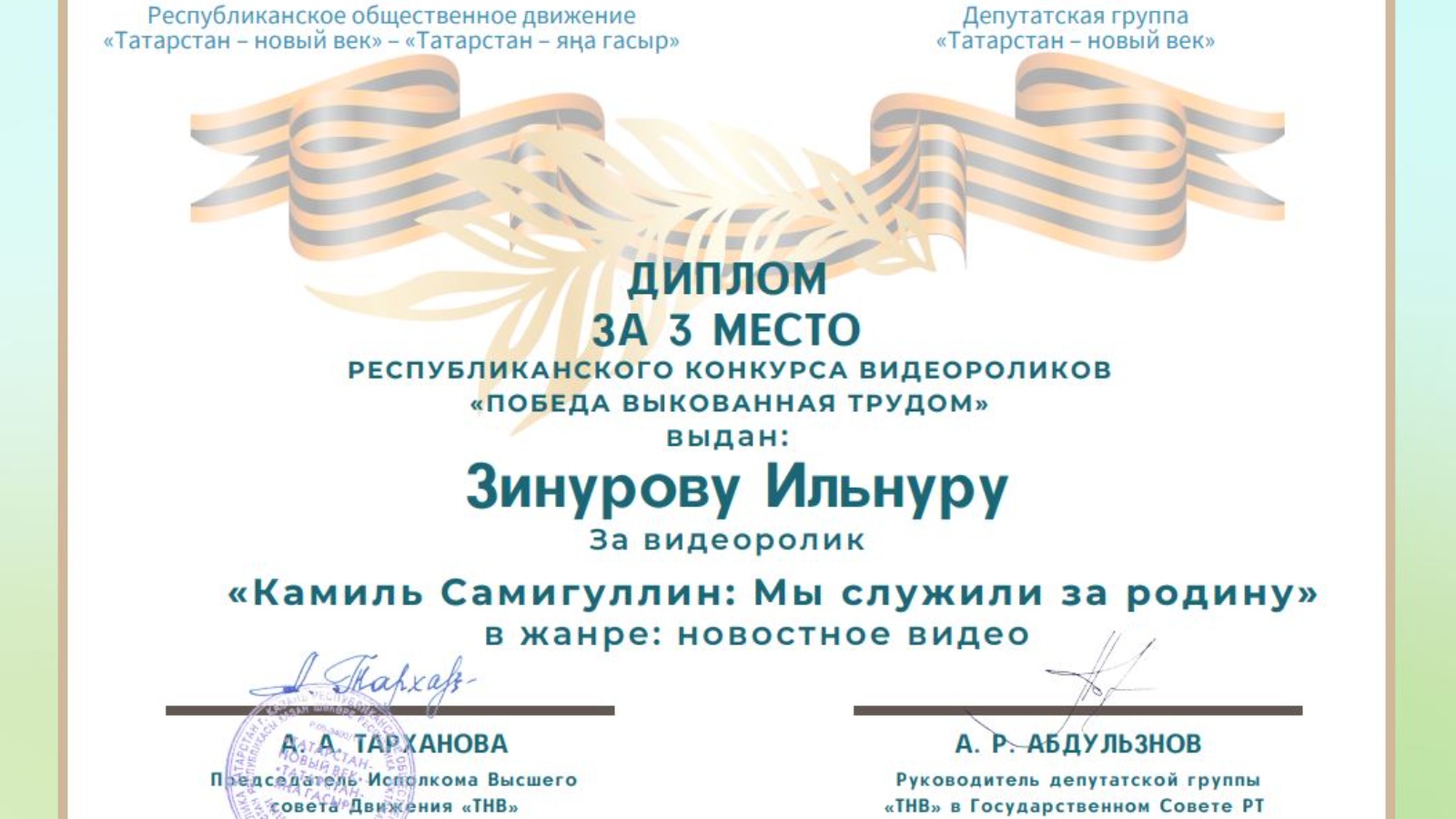 Новостное видео «Камиль Самигуллин: Мы служили за родину» стало одной из лучший работ, присланных на конкурс республиканского общественного движения «Татарстан-новый век» - «Татарстан-яңа гасыр» совместно с депутатской группой «Татарстан-новый век».