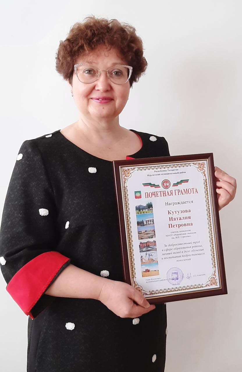 Наталию Кутузову, учителя технологии Нурлатской гимназии, вчера на общегородской планерке с участием руководителей глава района Алмаз Ахметшин наградил Почетной грамотой и денежным сертификатом.