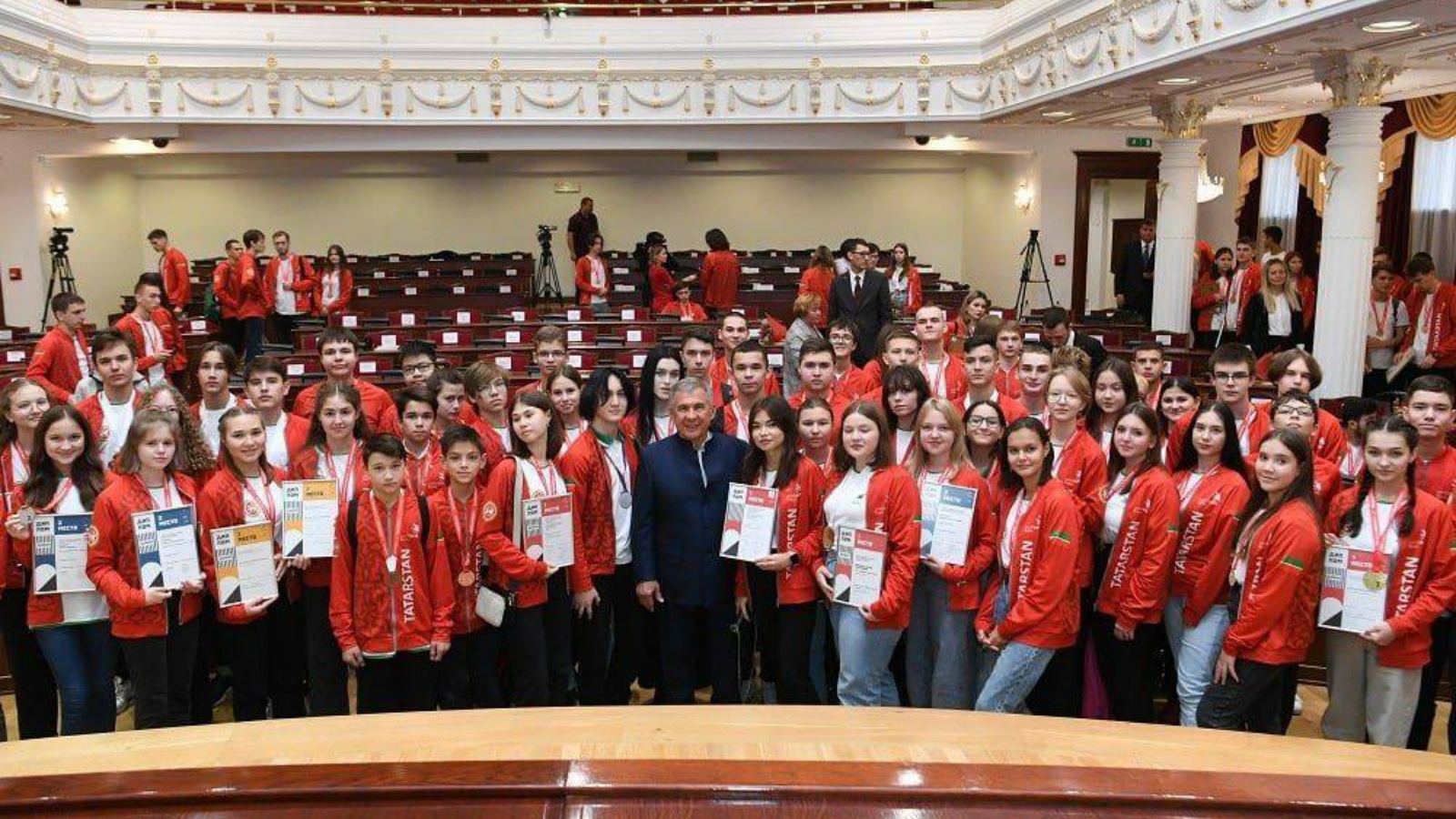 Встреча прошла в Представительском корпусе Казанского Кремля. Здесь Правительственными наградами отметили лучших участников сборной Татарстана, их наставников и родителей. Так, родители Алины Лилия и Сергей Ефимовы, а также ее наставник учитель технологии Наталия Кутузова удостоились Благодарности Министерства образования и науки Республики Татарстан.