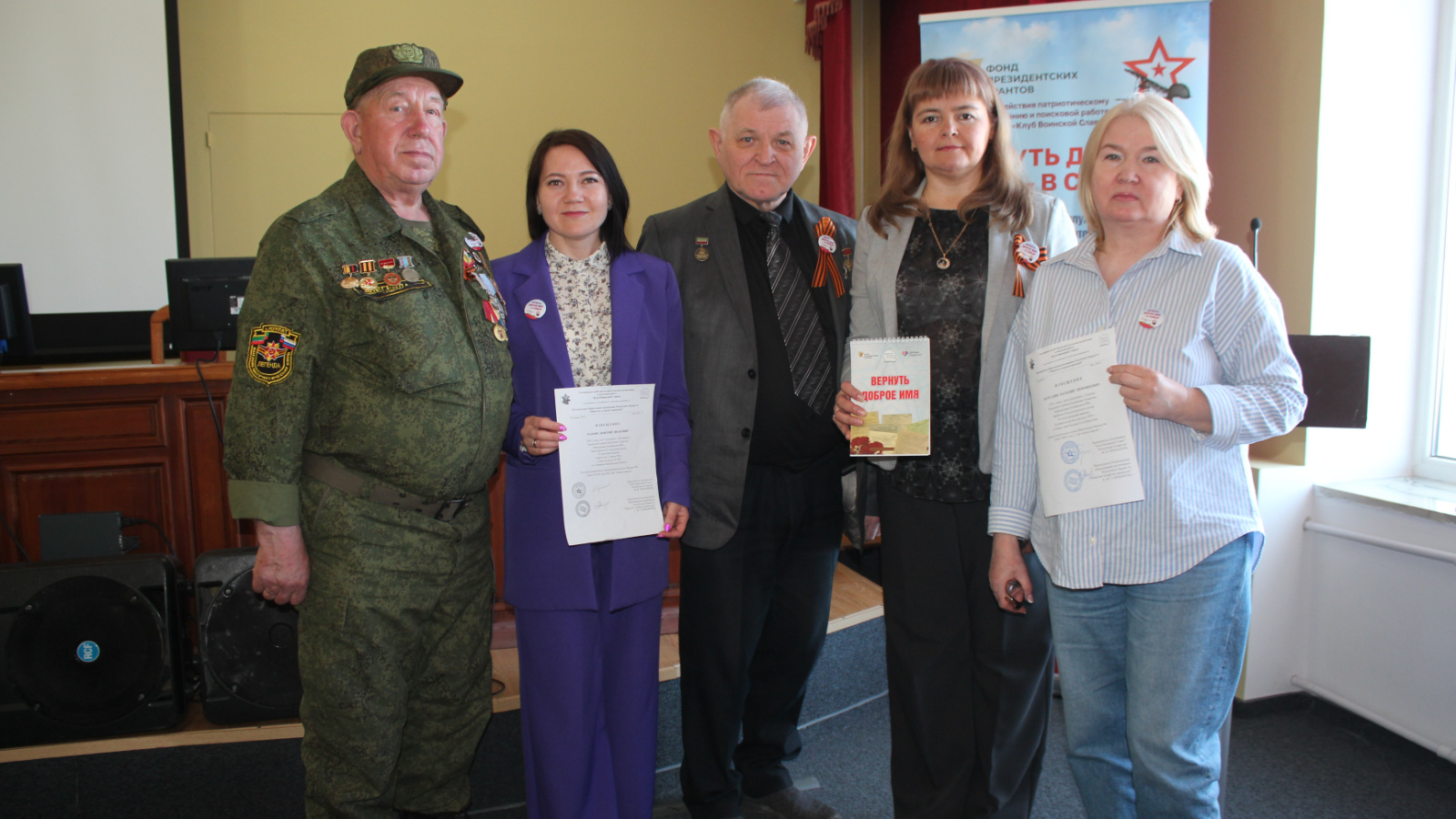 Михаил Валерьевич поблагодарил за сотрудничество руководителя клуба «Легенда» Владимира Малыгина и вручил его семье, готовящейся отметить золотую свадьбу, медаль за содействие в организации презентации брошюры и Марша памяти «Вернуть доброе имя – в семью». Также Благодарность Ассоциации получила руководитель Культурно-досугового центра «Грани» Дина Хуззятова.