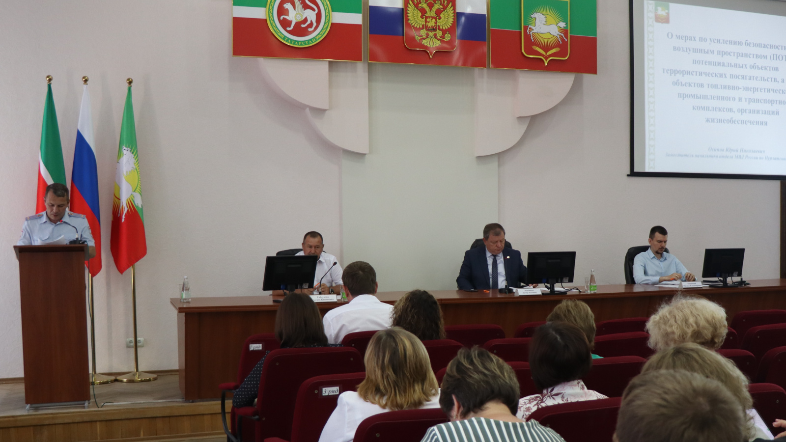 Одним из первых здесь рассмотрели вопрос о дополнительных мерах по усилению безопасности над воздушным пространством стратегически важных объектов. Об этом заслушали заместителя начальника по охране общественного порядка отдела полиции МВД России по Нурлатскому району Юрия Осипова.