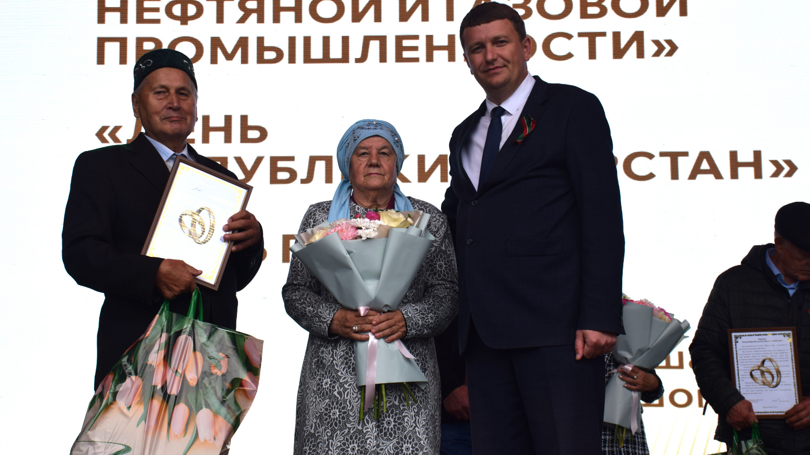 Особой и теплой частью праздника стало чествование семей-юбиляров, которые в этом году отмечают золотые и изумрудные свадьбы. Поздравительными адресами и памятными подарками их наградил заместитель главы Нурлатского муниципального района Иван Захаров. Под аплодисменты жителей района на сцену поднялись Аркадий и Валентина Клементьевы, Олег и Лидия Арбузовы, Илсияр и Мавлия Башировы, Александр и Валентина Евдокимовы, Зайнулла и Зайтуна Туешовы, Анвар и Роза Галимовы, Равиль и Тамара Каримовы и Василий и Нина Антоновы.