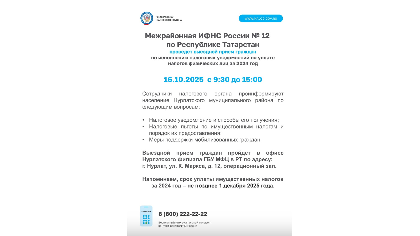 Межрайонная ИФНС России № 12 по Республике Татарстан проведет выездной прием граждан по исполнению налоговых уведомлений по уплате налогов физических лиц за 2024 год 16.10.2025 с 9:30 до 15:00 час.