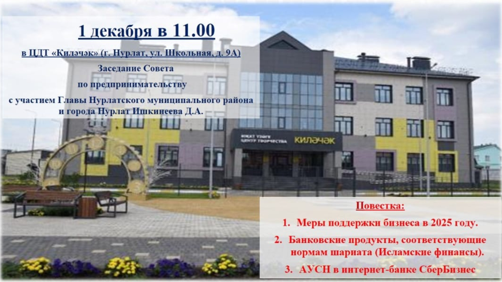 1 декабря в ЦДТ «Киләчәк» (г. Нурлат, ул. Школьная, д. 9А) состоится заседание Совета по предпринимательству с участием главы Нурлатского муниципального района и города Нурлат Дамира Ишкинеева.