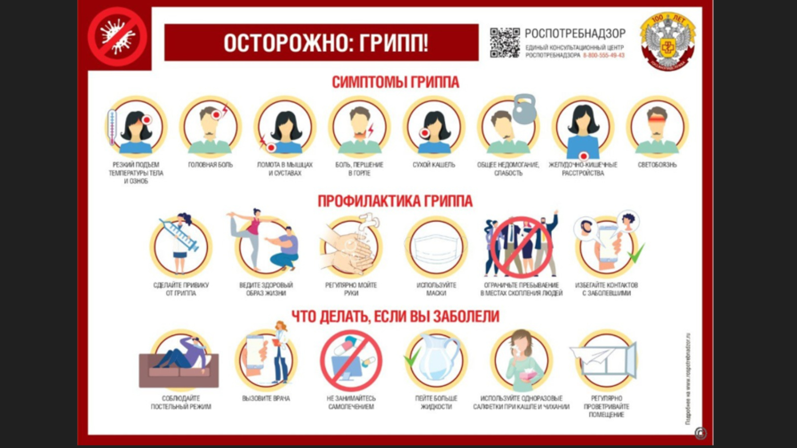 Помните: при появлении симптомов гриппа (высокая температура, головная боль, ломота в теле, кашель) оставайтесь дома и немедленно вызывайте врача! Не занимайтесь самолечением.