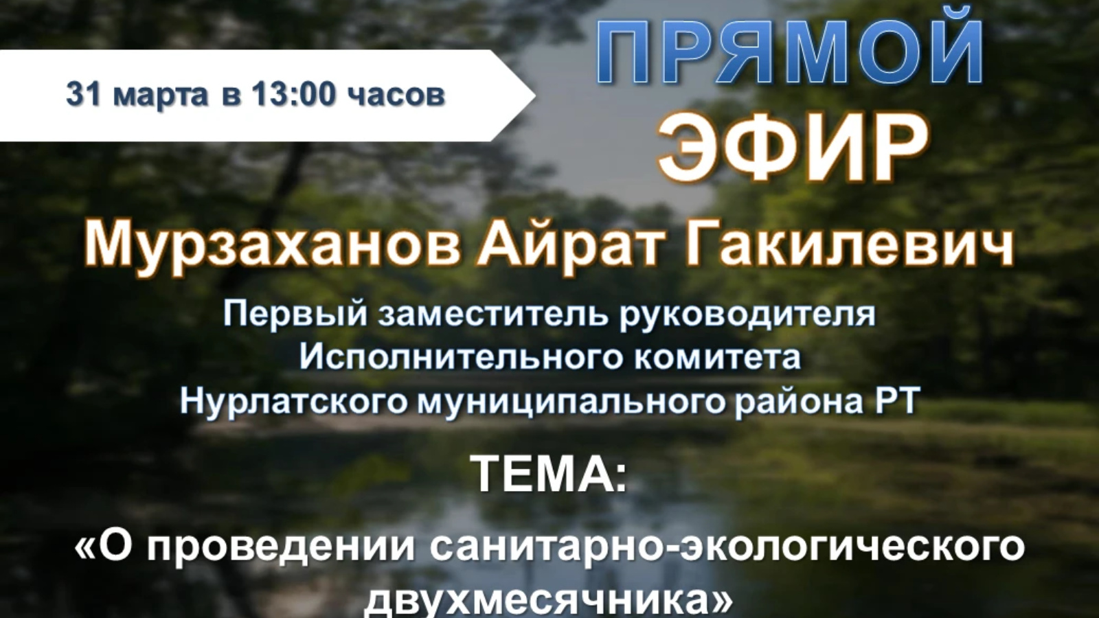 31 марта в 13:00 часов на нашей страничке ВКонтакте ( https://vk.com/nurlat.tatarstan ) состоится Прямой эфир с Мурзахановым Айратом Гакилевичем - Первым заместителем руководителя Исполнительного комитета Нурлатского муниципального района РТ .
