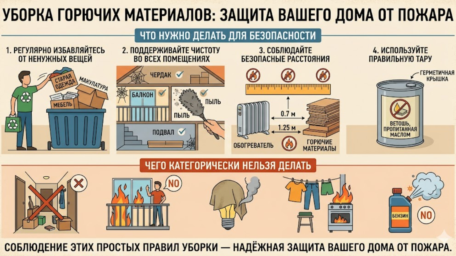 Соблюдение этих простых правил уборки и хранения горючих материалов — надёжная защита вашего дома от пожара.