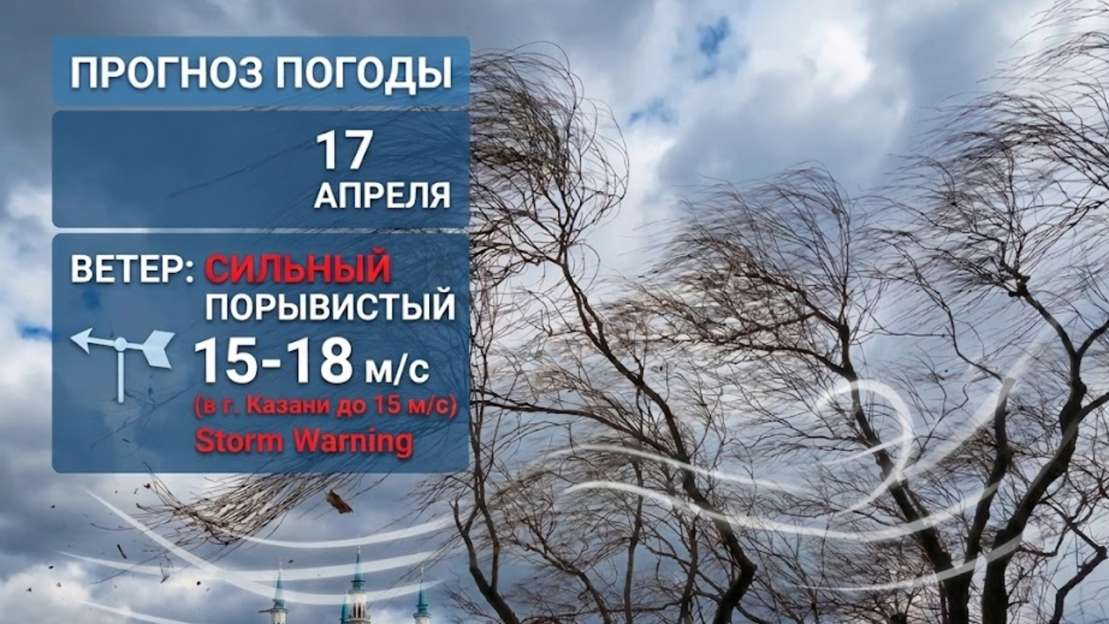 Днем 17 апреля 2026 г. на территории Республики Татарстан и в г. Казани местами ожидается сильный ветер порывами 15-18 м/с (в г. Казани до 15 м/с)..