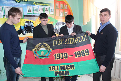 И хотя эта тема в связи с 25-летием вывода советских войск из Афганистана сегодня не сходит с уст, встреча с участниками боевых действий в «горячих» точках произвела на студентов глубокое впечатление. В душе они словно соприкоснулись с событиями минувших лет. Да и сами воины-интернационалисты, вглядываясь со сцены в лица молодых людей, частично в их очертаниях видели себя в беспечной юности. Но воинский долг заставил их взглянуть на мир иными, уже взрослыми глазами. Участники встречи Мунир Ахметшин, Владимир Игнатьев, Ришат Сафиуллин и Загир Абдуллин поделились своими воспоминаниями об этой необъявленной войне. Они сильны братством. У каждого из них своя, живая история, и ее отголоски в сердцах воинов-интернационалистов звучат по сей день. Владимир Игнатьев, выполнявший воинский долг в Кабуле, принес на встречу памятный флаг. Точно такие же сегодня есть практически у всех, кто сражался в составе 181-го мотострелкового полка. Его нашему земляку подарил сослуживец из Самары. А два года назад Владимиру Витальевичу прислали специальный знак, изготовленный для всех воинов этого полка. И это тоже часть живой истории, которая прозвучала на уроке мужества. Здесь вспомнили и почтили память минутой молчания земляков, которые погибли во время боевых действий в Афганистане и Чечне. Военный комиссар района Загир Абдуллин обратился ко всем студентам, которым предстоит идти в армию, нести свою службу с честью и достоинством, стать примером для всех. А в завершение встречи символично прозвучала песня «Мы не хотим войны» в исполнении студентов техникума Андрея Зимина и Евгения Петрова.