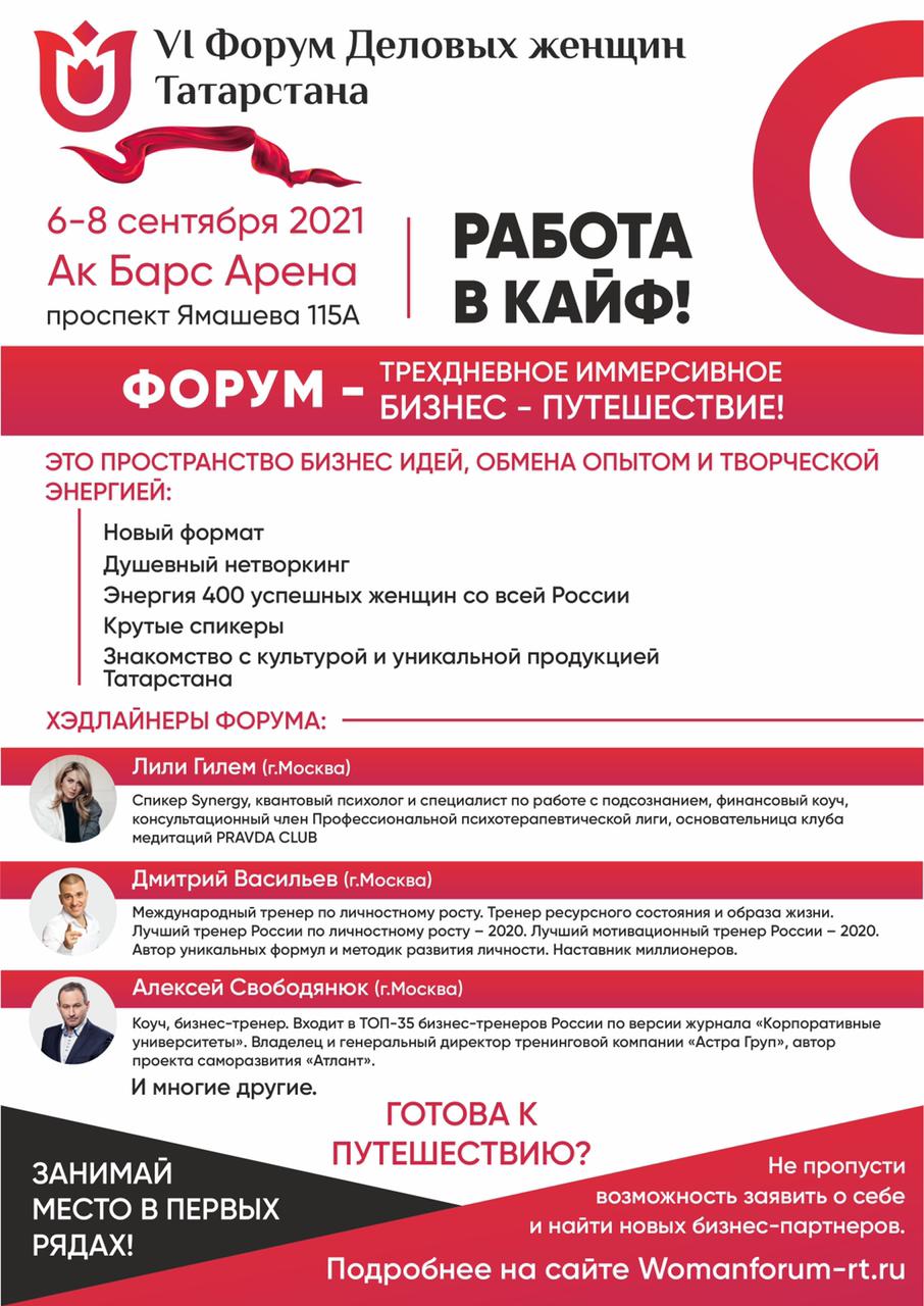 6 - 8 сентября 2021 года в Казани состоится VI форум деловых женщин Республики Татарстан «Работа в кайф»