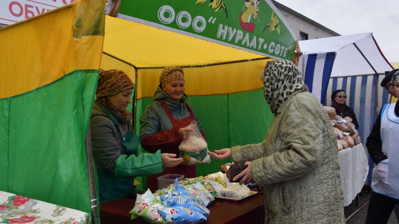 Бүген Нурлат шәһәренең Кооператив урамында бәйрәм авыл хуҗалыгы ярминкәсе уза, анда җирле җитештерүчеләр үз продукцияләрен киң ассортиментта тәкъдим итә.