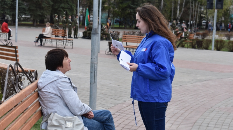 Җиңү көне уңаеннан “Яшь гвардия” активистлары җирле “Зәңгәр яулык” партия проекты кысаларында шәһәрлеләргә буклетлар өләштеләр.
