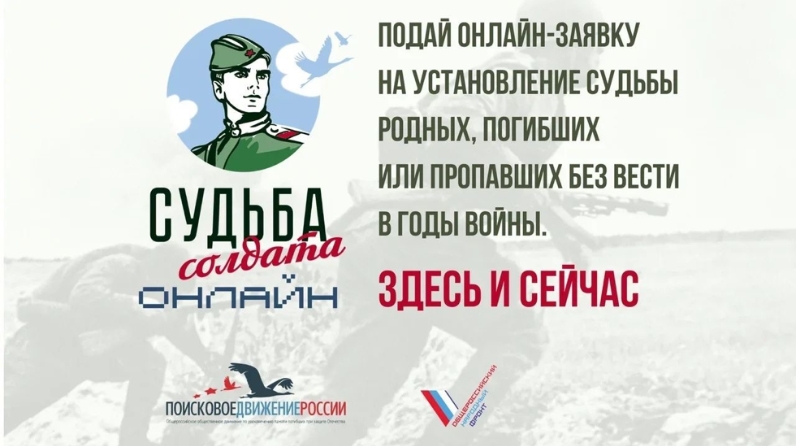 Бөек Ватан сугышы елларында хәбәрсез югалган яки вафат булган туганнарның фронт язмышларын ачыклау буенча "Россия эзтабарлар хәрәкәте" 2020 елның 15 апреленнән "Солдат язмышы онлайн" проектын башлап җибәрделәр.