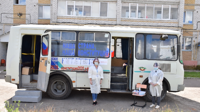 Бүген РФ Конституциясенә төзәтмәләр буенча тавыш бирүнең бишенче көнендә мобиль автобуслар Садовая һәм Мәктәп урамынарында, Нурлат АТПсы янындагы күпфатирлы йортлар янында тукталдылар.