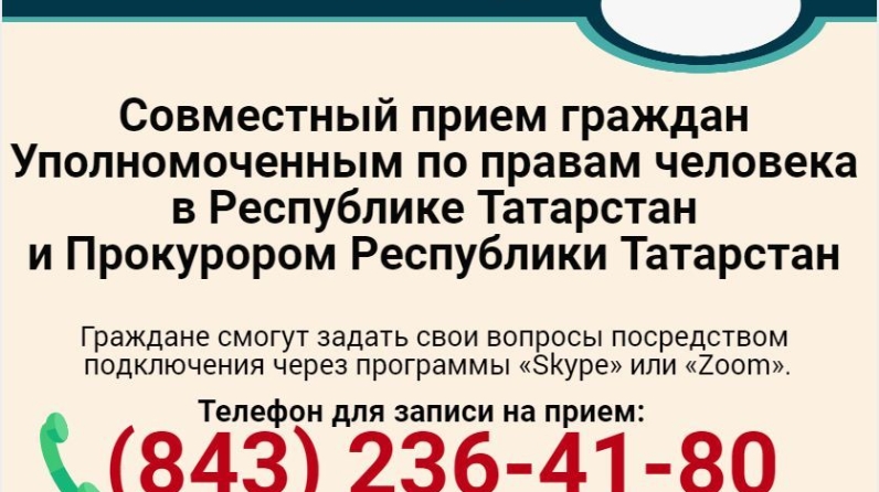 14 июльдә Татарстан Республикасындагы Кеше хокуклары буенча уполномоченный Татарстан Республикасы Прокуроры белән бергә гражданнарны видеоэлемтә буенча кабул итәчәк.