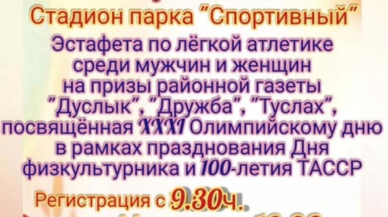 10.30- Шахмат, шашк буенча ярышлар. Район газетасы призына җиңел атлетика эстафетасы, футбол, флорбол буенча ярышлар.