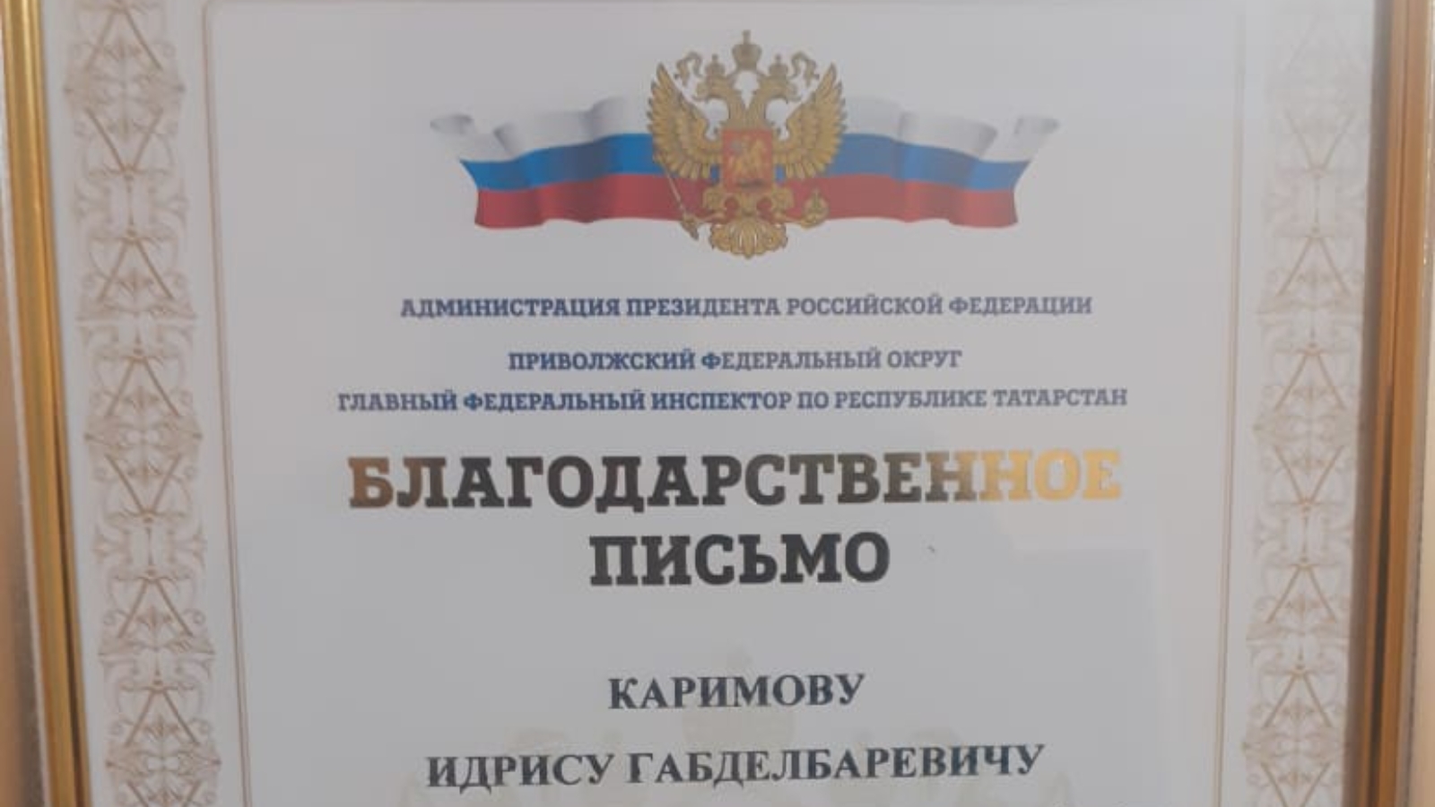 ТР буенча инспектор Виктор Демидов Татарстан Республикасында Кеше хокуклары буенча вәкаләтле вәкилнең Нурлат районындагы җәмәгать ярдәмчесе Идрис Кәримовка Рәхмәт хаты тапшырды.