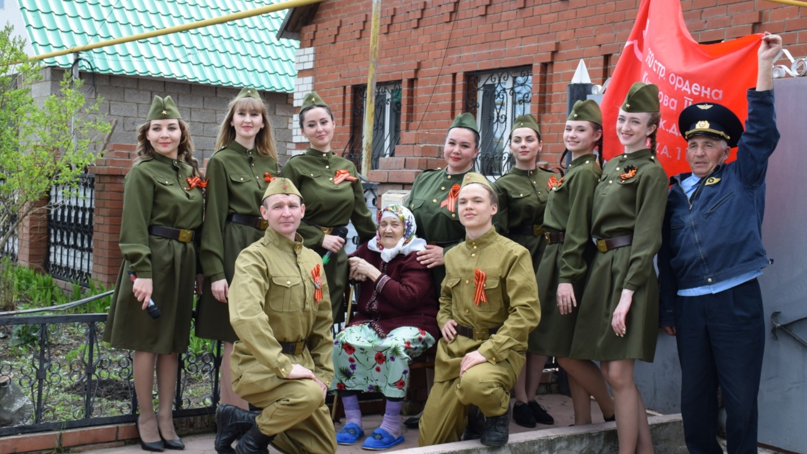 Ишегалдында фронт җырлары яңгырады, ә ветераннар үзләре парад тамашачыларын үз йортлары тәрәзәләреннән артистларны сәламләде. Мобиль иҗади агитбригада бүген шәһәр буйлап чыгып, Бөек Ватан сугышы ветераннарын өй янында котлады. Мәдәният бүлегенең иҗат бригадасында катнашучылар сугыш ветераннарын, гы Ленинград блокадасы катнашучыларын җылы теләкләр белән котладылар, алар өчен сугыш еллары җырларын башкардылар, вальс биеделәр. Бөек Ватан сугышы ветераны Александр Лебедев үз балконы тәрәзәсеннән хәрби формаларда катнашучыларны сәламләде. Һава торышы бик матур, ишегалдында ветеран үзе утырткан шомырт чәчәк ата. Ә ветеран өчен куелган концертны карарга күршеләре дә чыкты, кайберләре үзләре белән туганнарының фотосурәтләрен алып килде. Вера Родионова әтисе фотосурәтен алып чыкты.