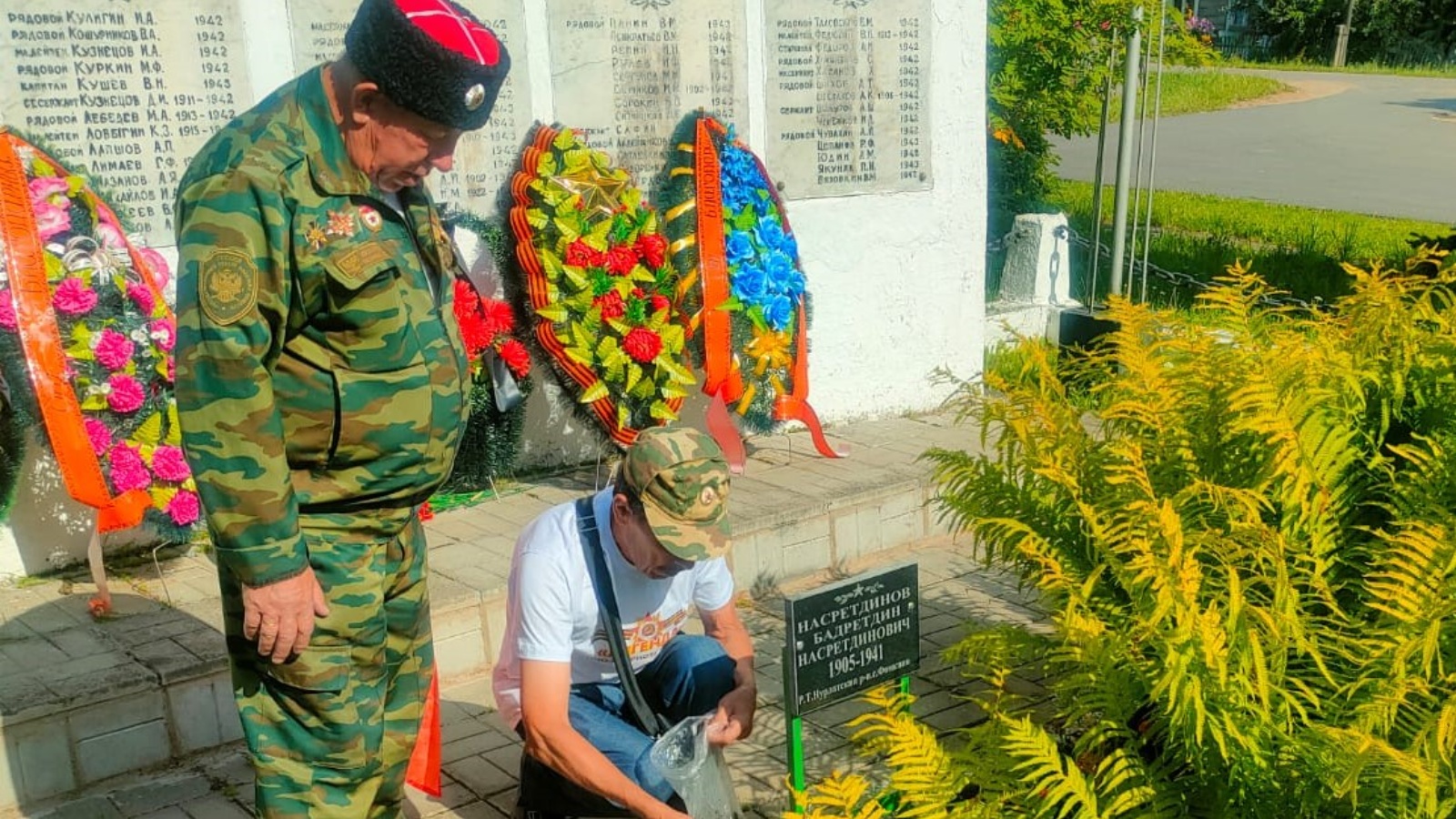 «Легенда» хәрби-патриотик клубы җитәкчесе Владимир Малыгин һәм Фома авылыннан фронтовик Бәдретдин Насретдиновның оныгы Минхадый Насретдинов Тверь өлкәсендә туганнар каберлегендә мемориаль такта урнаштырды.