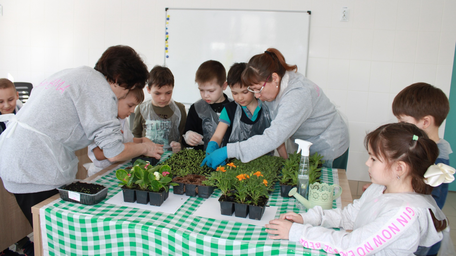 Педагог Татьяна Фадееваның петунияләр, бархатцылар һәм бегонияләр кебек чәчәк культураларын күчереп утырту буенча осталык дәресе балаларның беренче практик тәҗрибәсе булды.