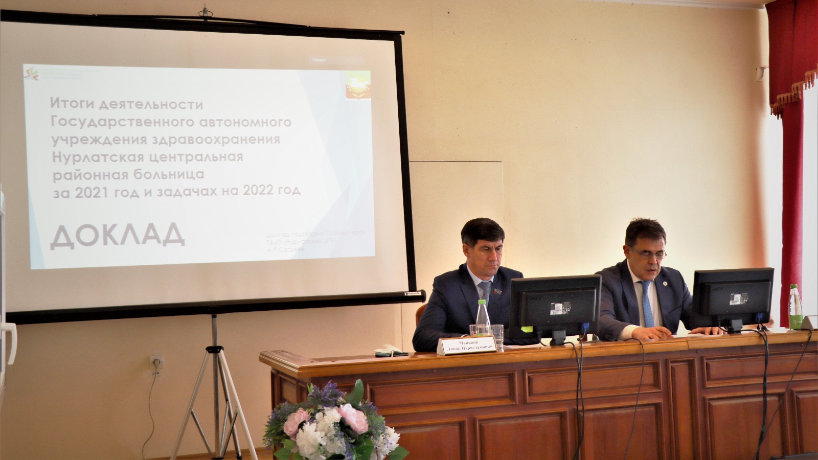 Нурлат үзәк хастаханәсенең баш табибы Айдар Сәгъдиев үз докладында район үзәк хастаханәсенең 2021 елда эшчәнлек нәтиҗәләре һәм агымдагы елга бурычлар турында җентекләп сөйләде.