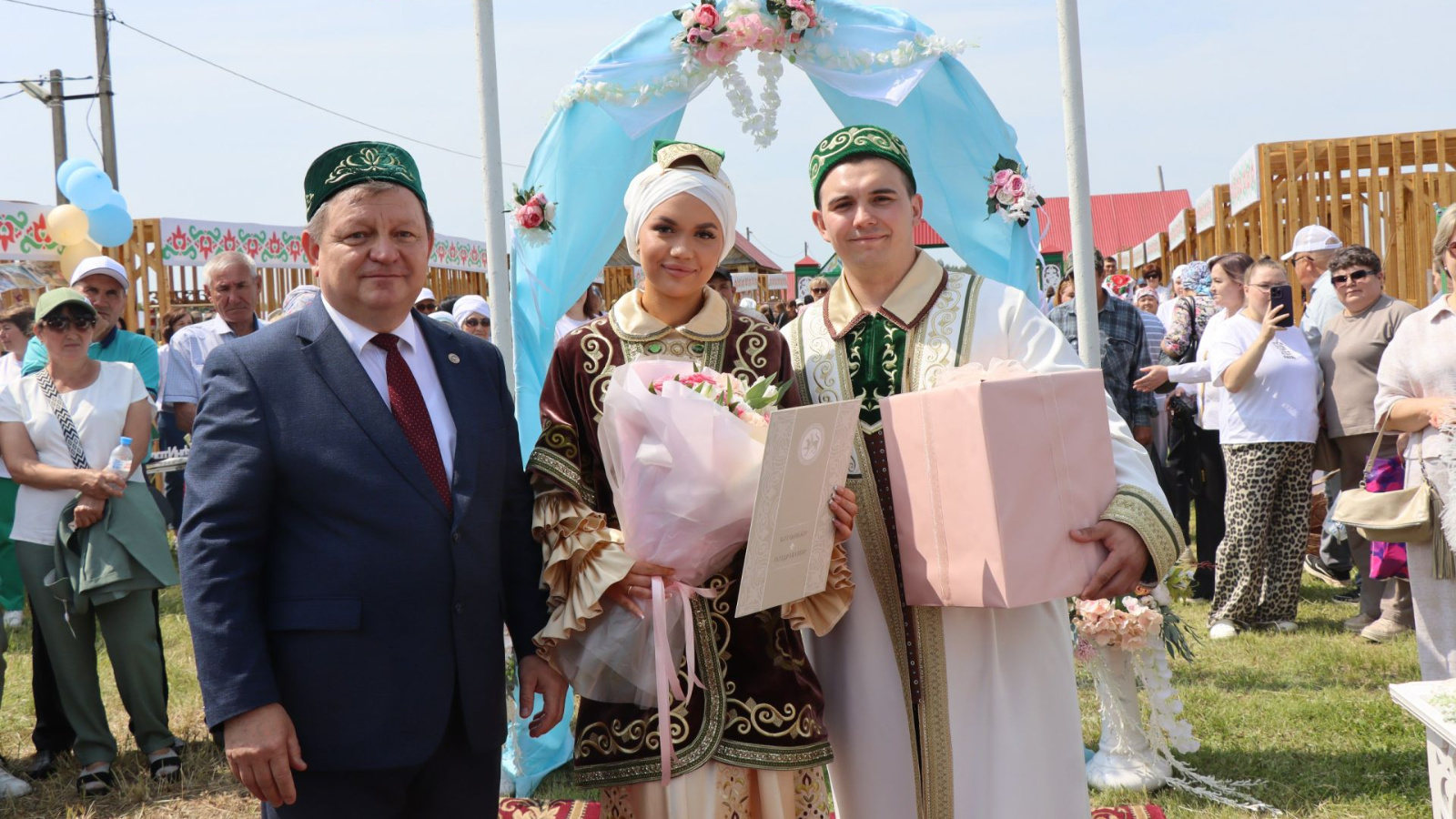 Стильләштерелгән милли костюмнар кигән яшь пар бәйрәм мәйданчыгының игътибар үзәгенә әверелде. Сабан туе кунаклары арасында ачык һавада уздырылган никах теркәү тантанасы үзенә бертөрле колорит һәм күңелгә ятышлы булды.