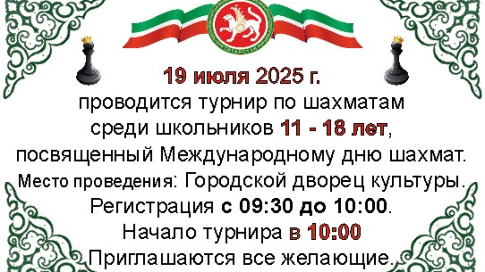 Иртәгә, 19 июльдә, Нурлат шәһәренең Мәдәният сараенда 11-18 яшьлек укучылар арасында Халыкара шахмат көненә багышланган турнир узачак.