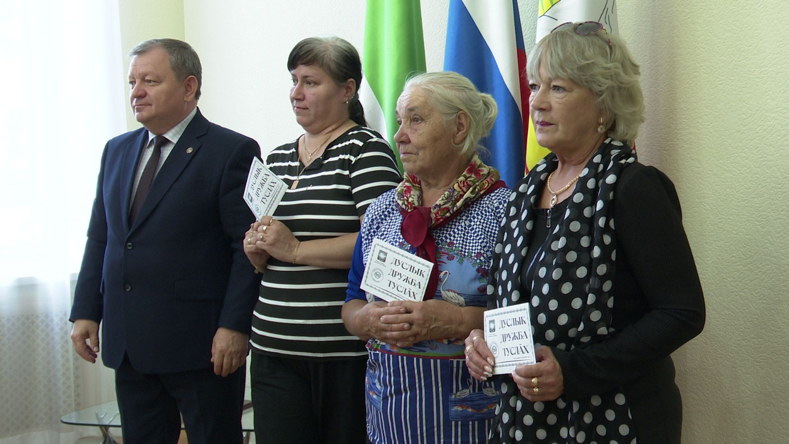 Нурлаттан Тәнзилә Хәмзә кызы Җаббаровага, Егоркино авылыннан Вера Ивановна Кадяшевага һәм Тимерлек авылыннан Диана Николаевна Галиуллинага шәхсән үзе имзалы квитанцияләре һәм бүләкләр тапшырды.